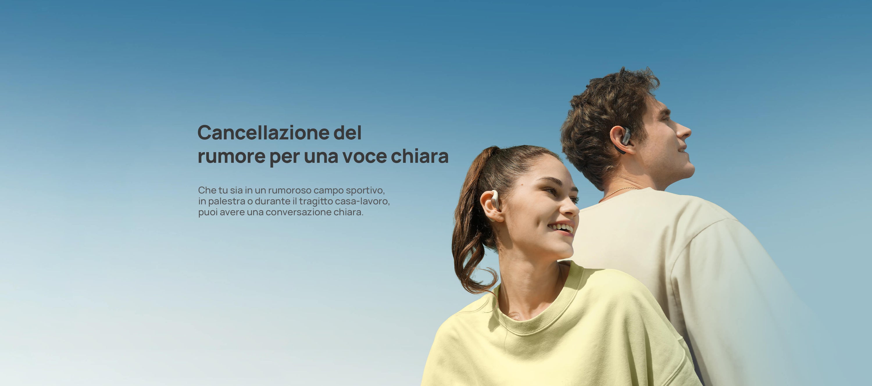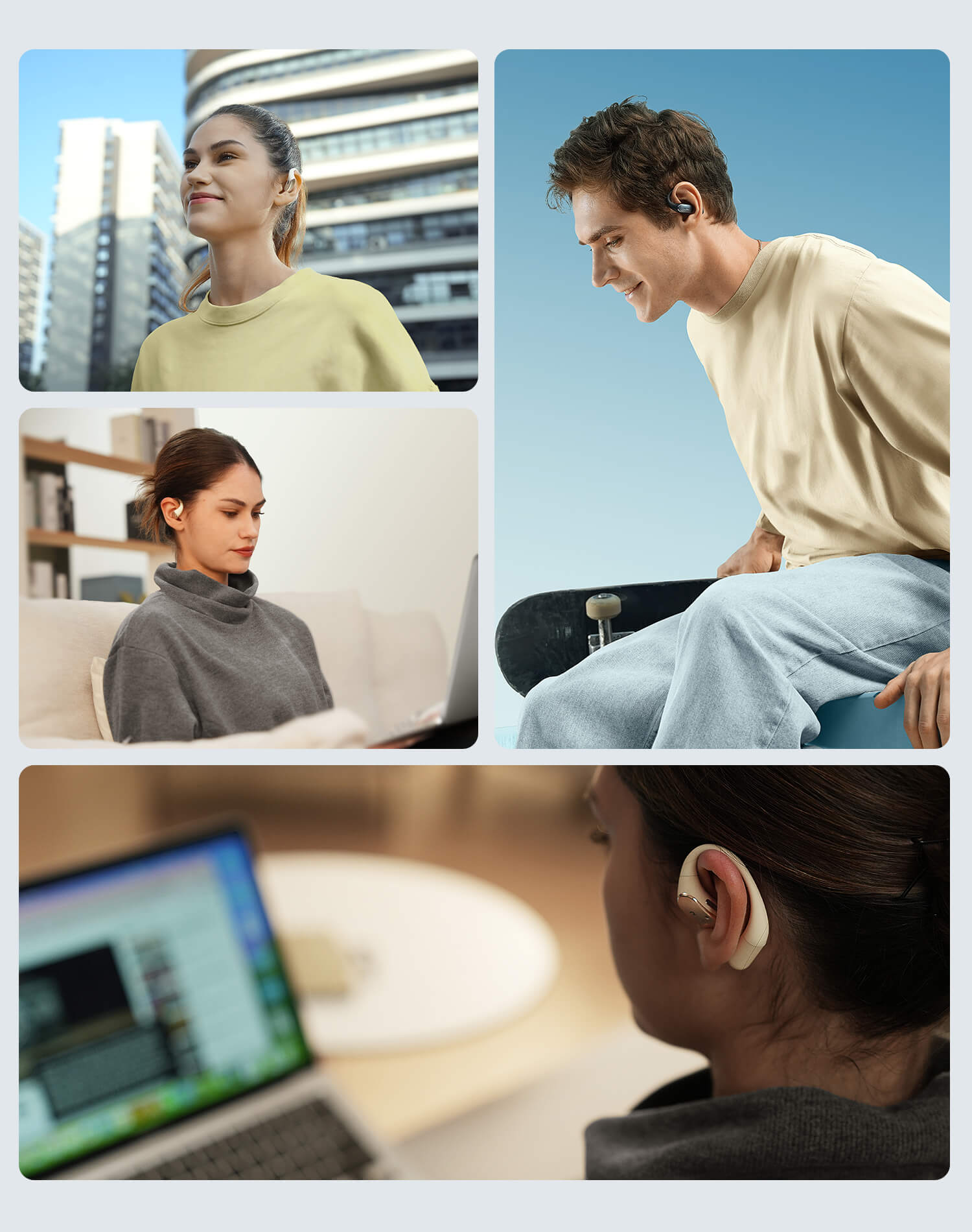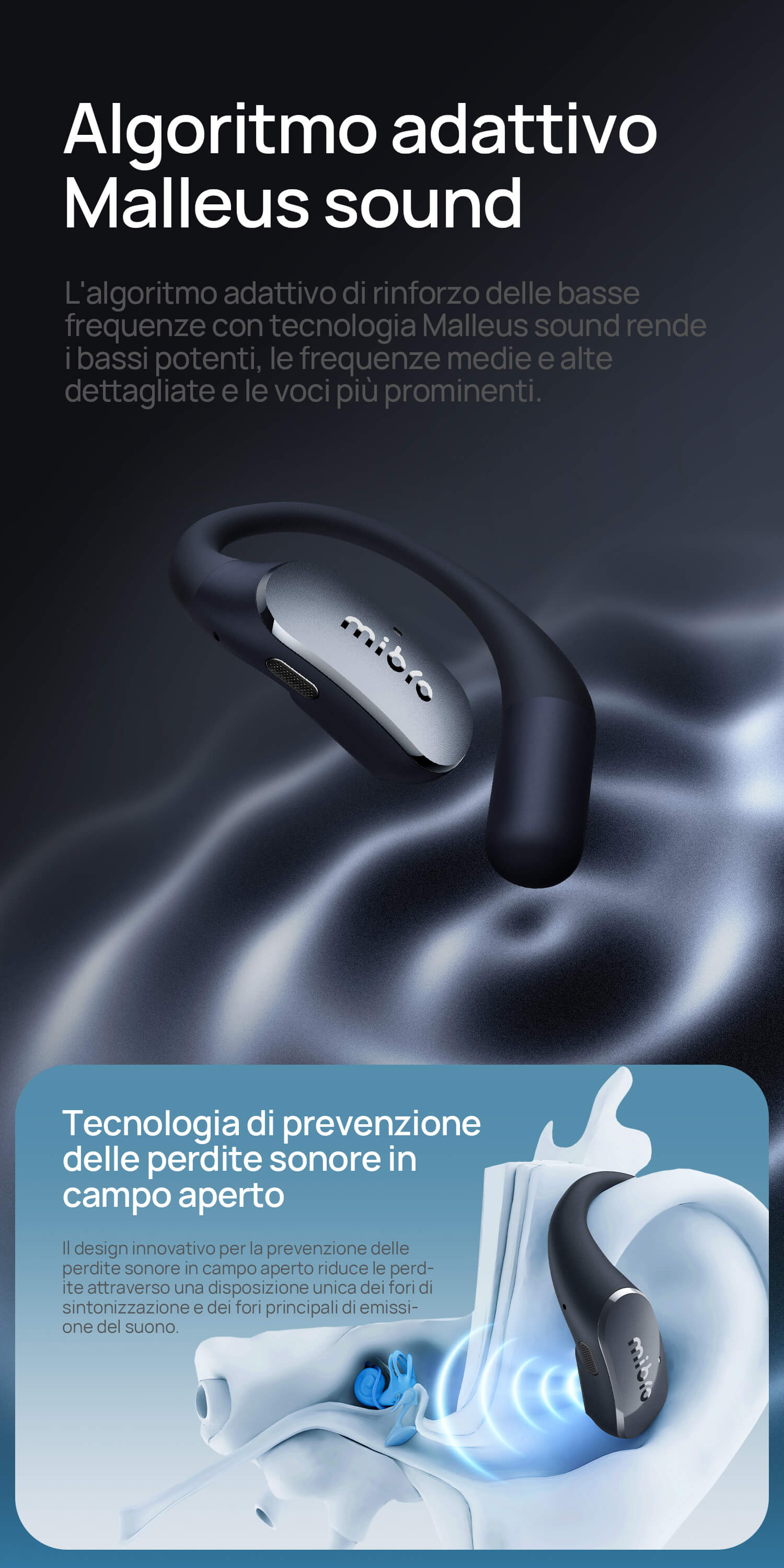 Solo 7,2g con struttura open-ear senza pressione. I ganci in titanio sottile e silicone molecolare sono ipoallergenici e antiscivolo.