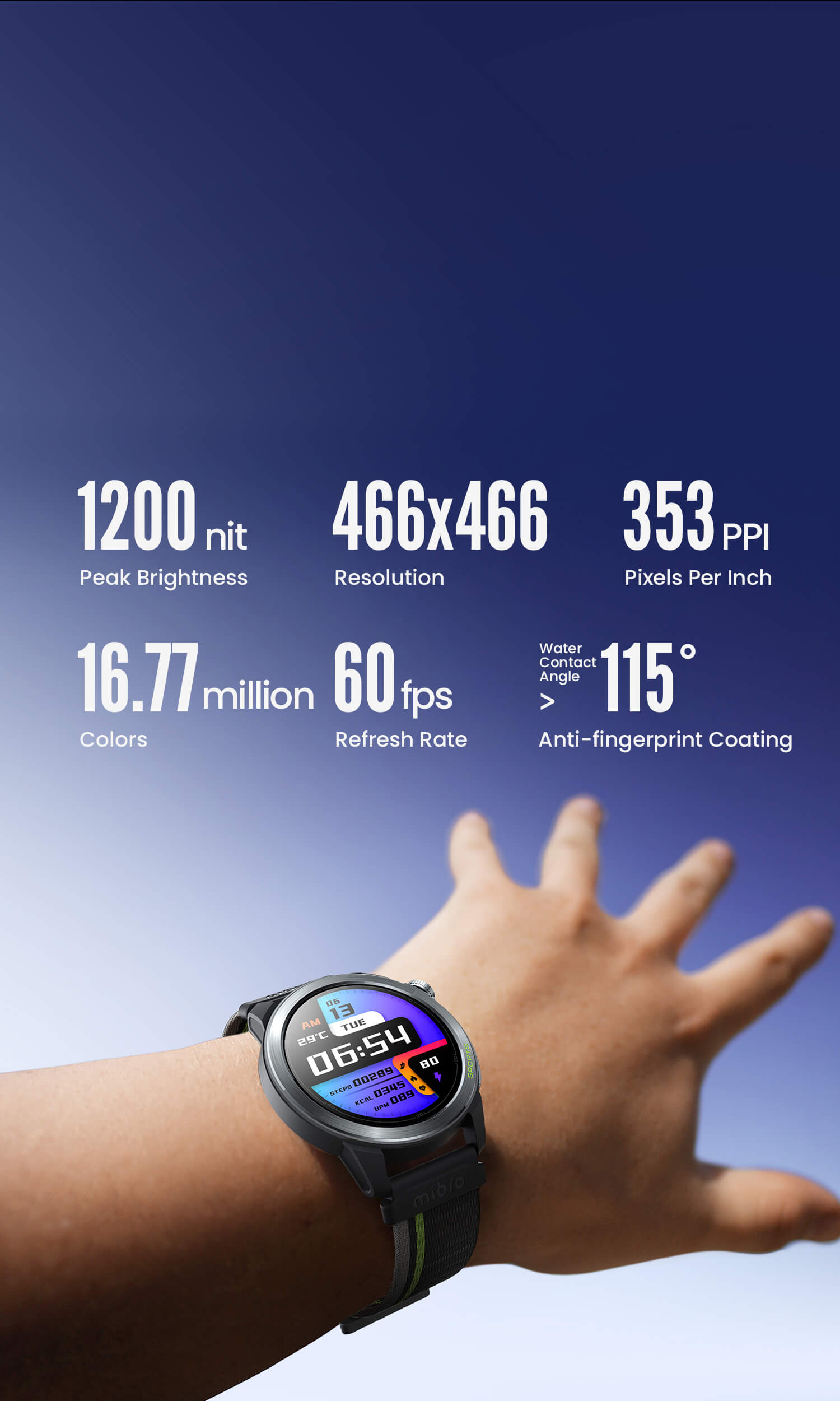 1,32" Amoled rotondo, 466*466, 1200 nit, PPI 353