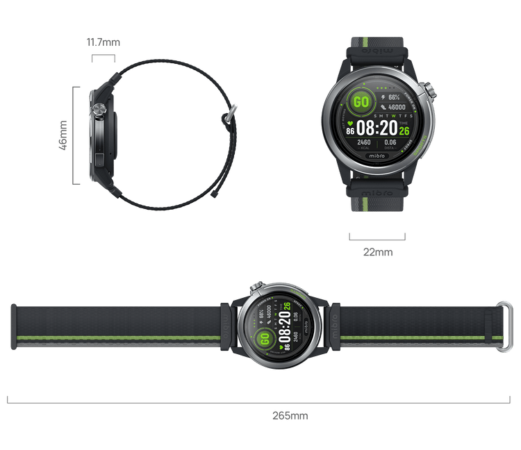 Fino a 20 giorni in modalità giornaliera o 15 ore con GPS attivo. Con Mibro Galaxy OS 2.0 per quadranti personalizzati, sincronizzazione dati sportivi (Strava, Apple Health, Google Fit), chiamate Bluetooth, 150+ modalità sport e resistenza all'acqua 5ATM (50m).