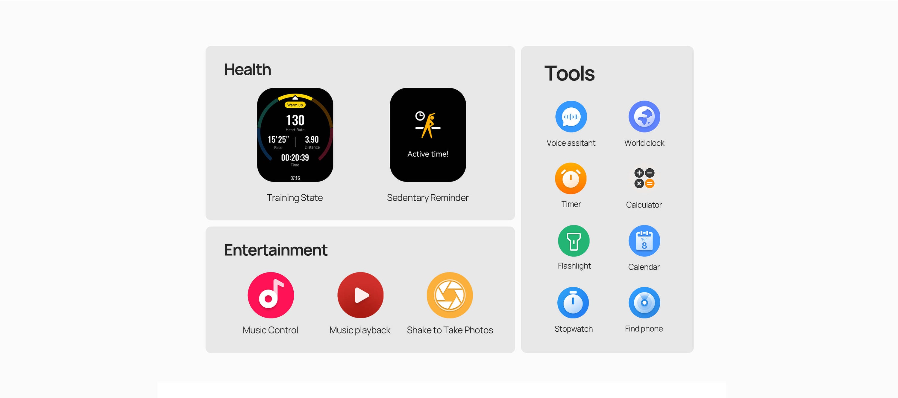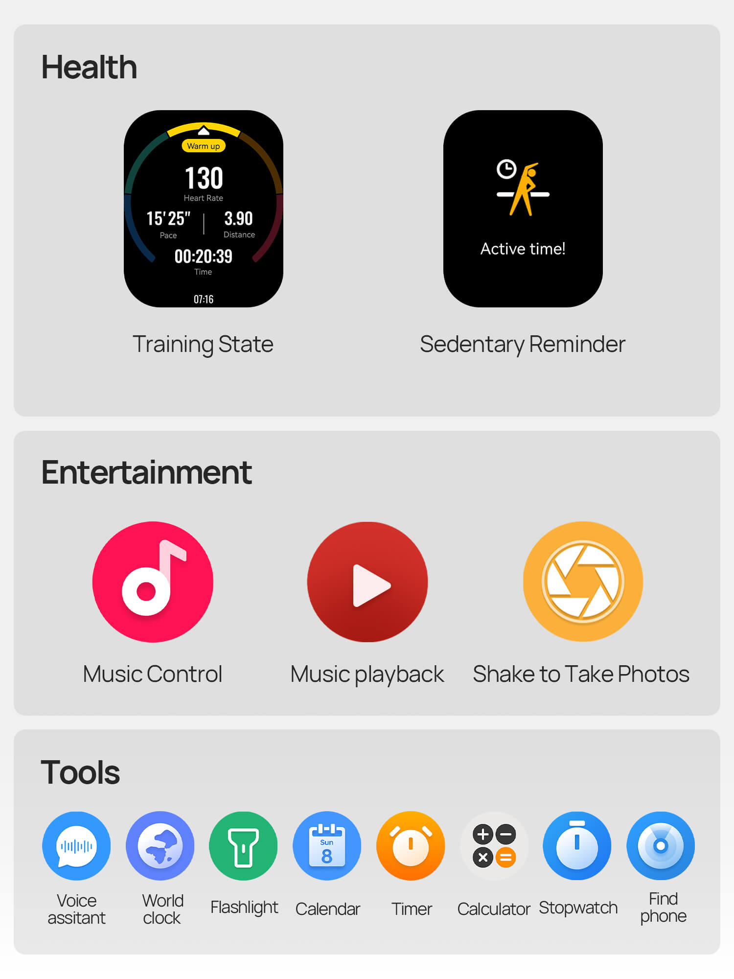 Messaggi push dell'app, notifiche push del meteo, notifiche push delle chiamate in arrivo, promemoria sulla salute, gestione dei contatti, ricerca dell'orologio, fotografie da remoto, impostazione del viso acquatico, registrazione dei movimenti, registrazione del sonno, salute settimanale.