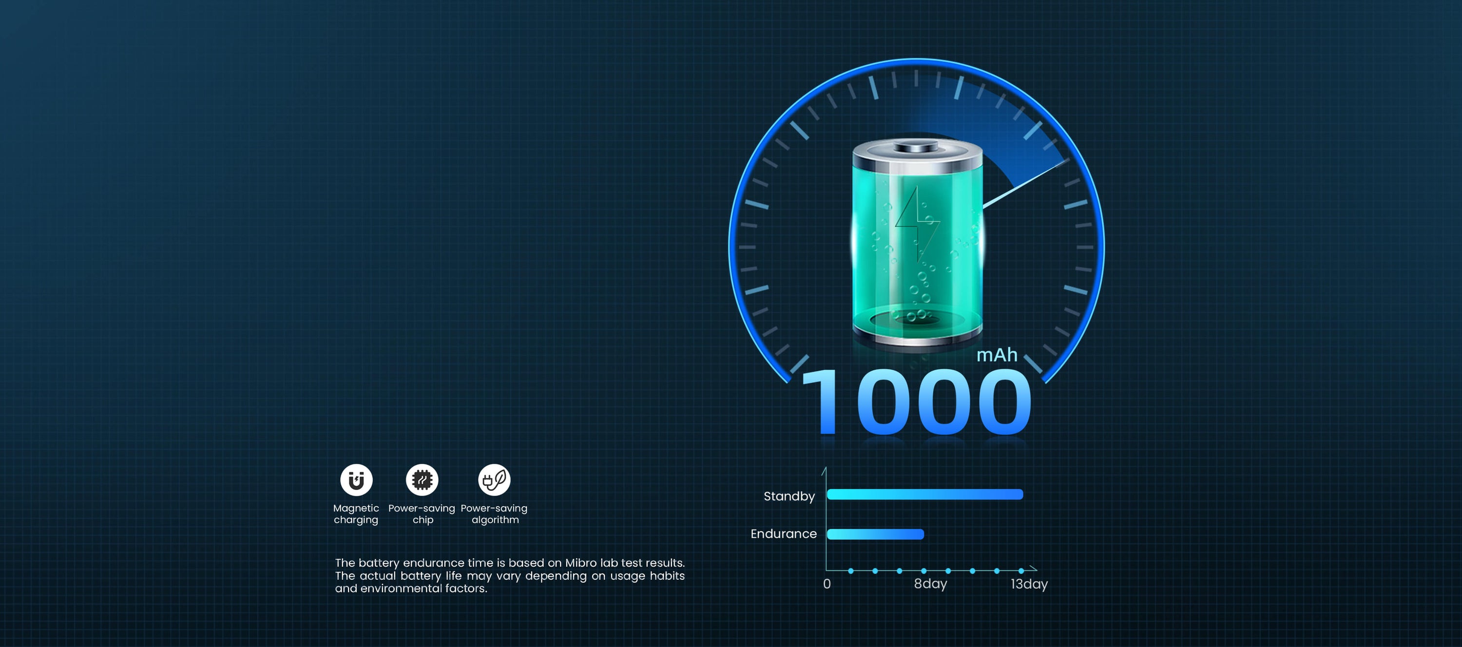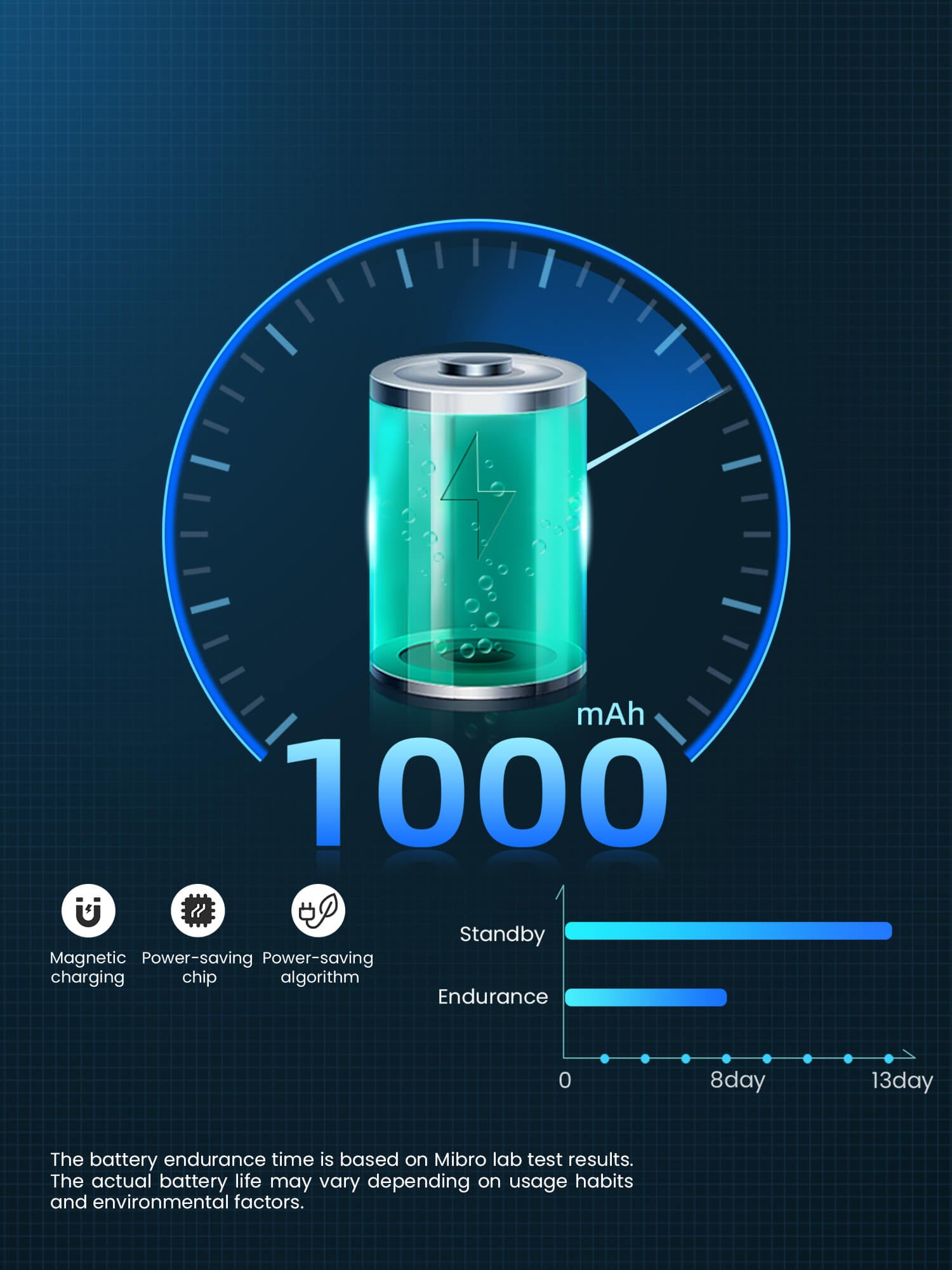Dotato di una batteria da 1000 mAh leader di mercato, caricabatteria magnetico e tecnologia di risparmio energetico per un massimo di 13 giorni in standby e 8 giorni di utilizzo.